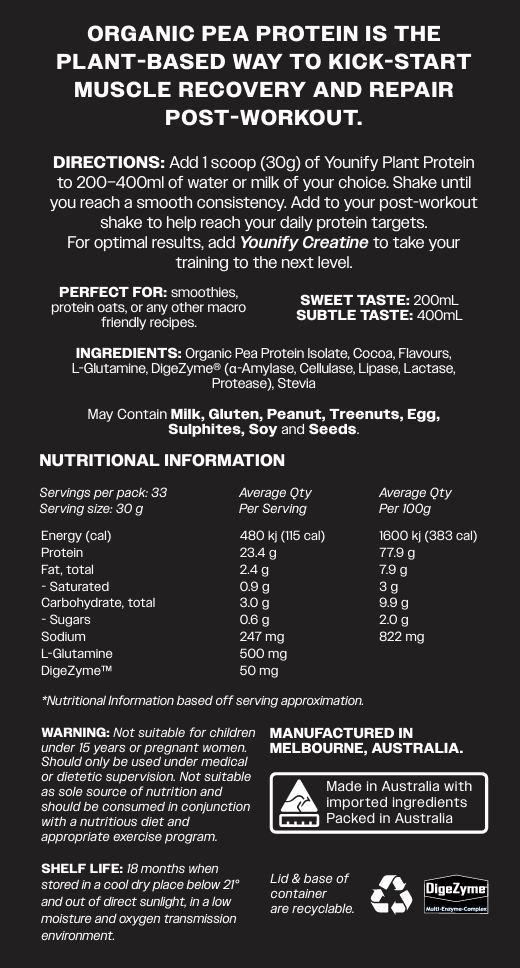 With less than 115 calories per serving, Younify Vegan Protein provides you with over 23g of the highest quality Pea Protein with less than 3g of carbohydrates and fat and includes a healthy dose of plant fibre.