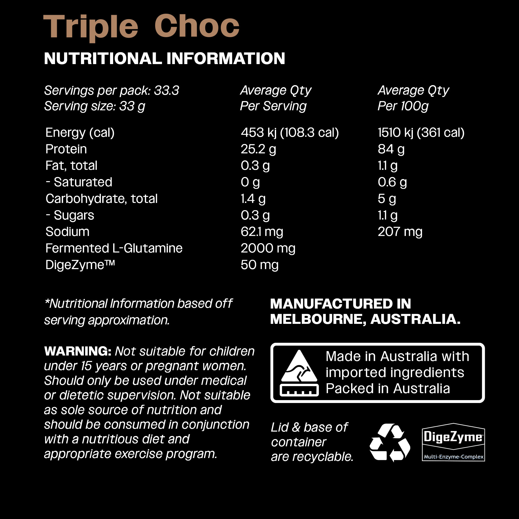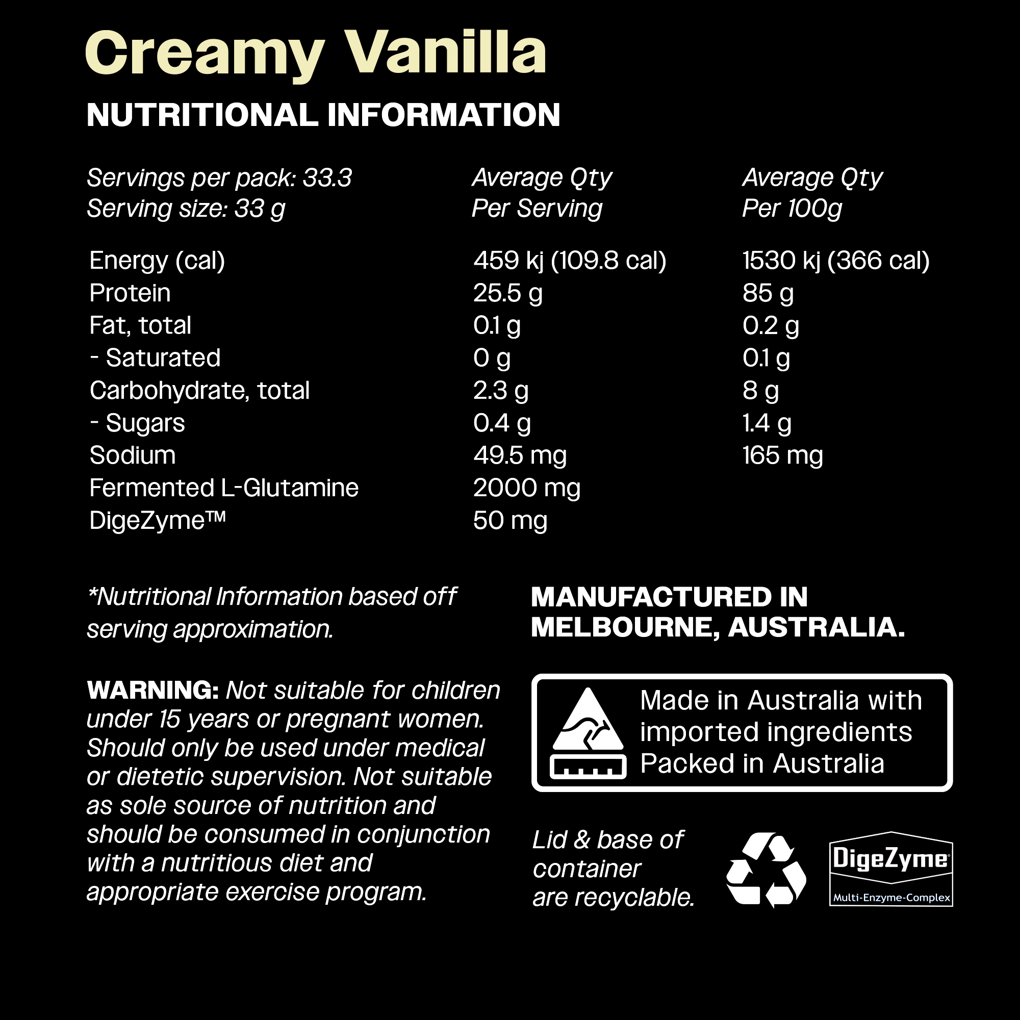 Fermented L-Glutamine, Flavour, DigeZyme ™(a-Amylase, Cellulase, Lipase, Lactase, Protease), Sucralose. *Instantised with Sunflower Lecithin
