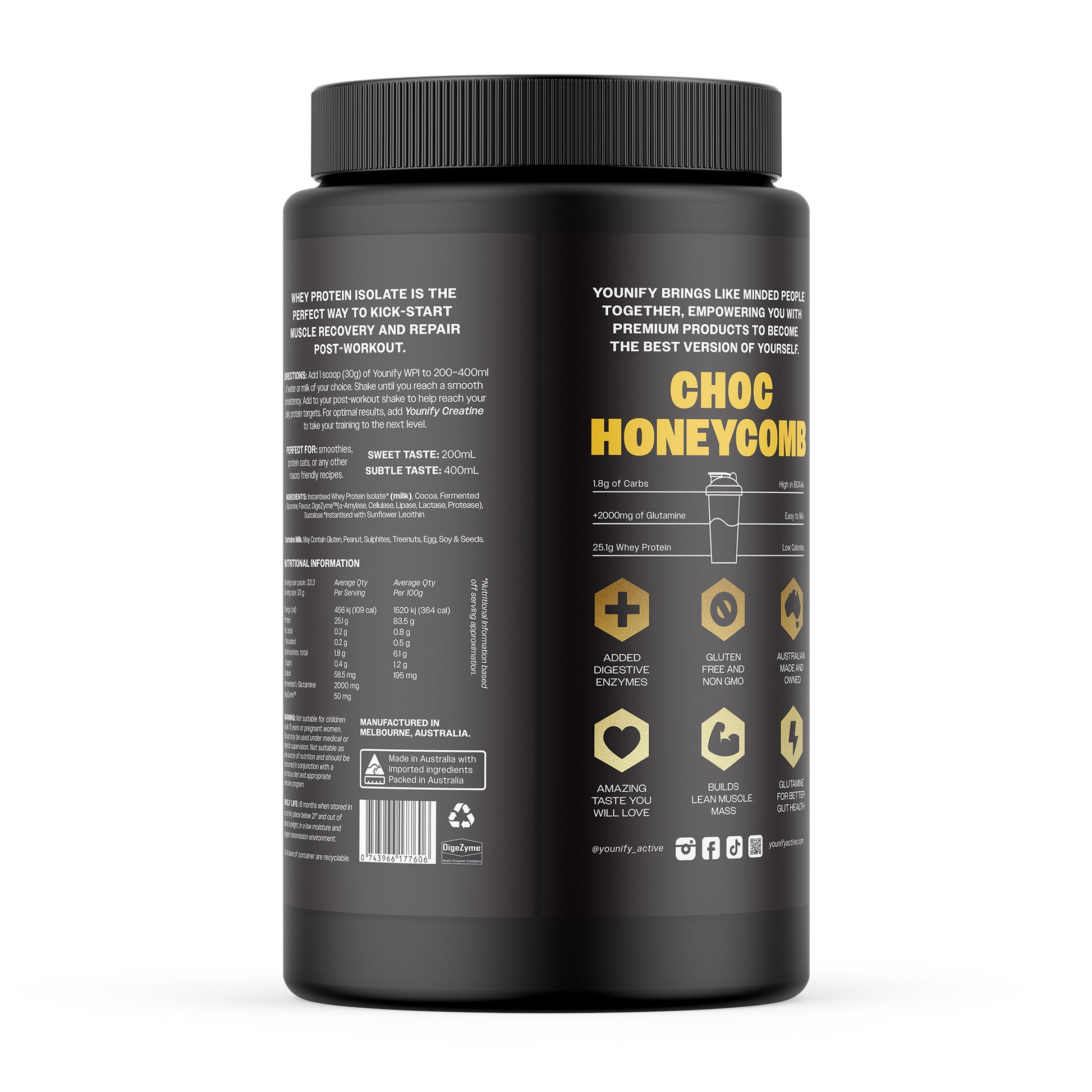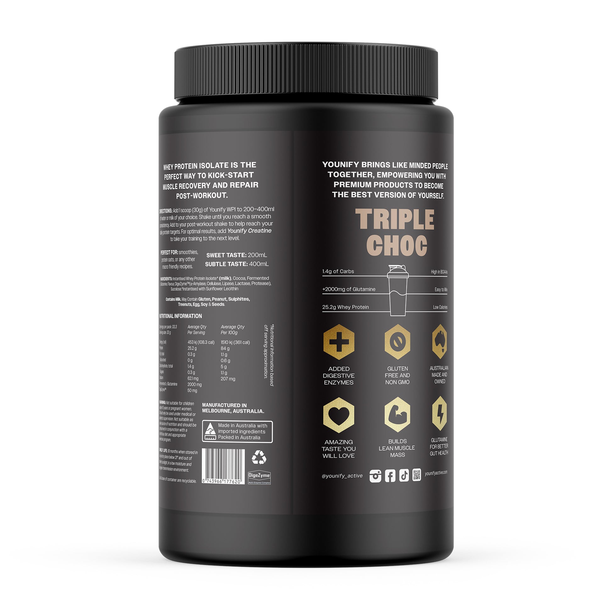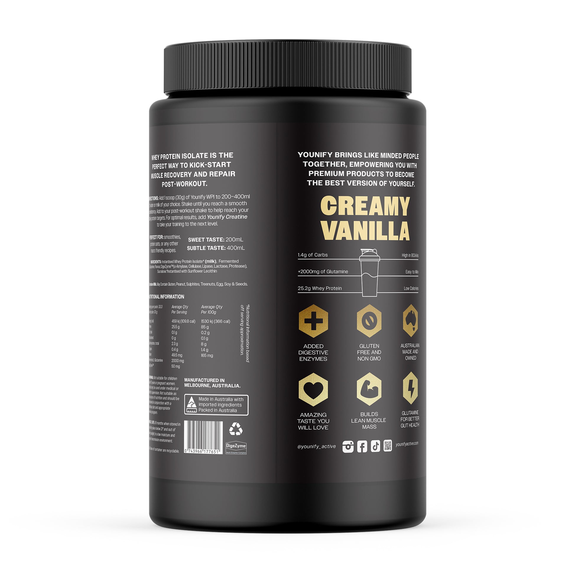 Younify Whey Protein Isolate is a high quality, non-GMO protein blend for lean muscle development, recovery and weight management.