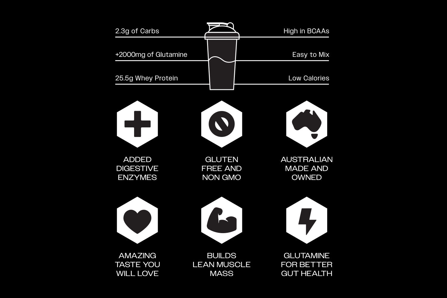 Instantised Whey Protein Isolate* (milk), Fermented L-Glutamine, Flavour, DigeZyme™(a-Amylase, Cellulase, Lipase, Lactase, Protease), Sucralose. *Instantised with Sunflower Lecithin